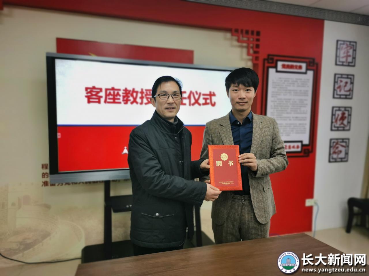 新闻网讯(通讯员 喻频莲 李文胜)12月16日上午,中央电视台《乡约》 《喜上加喜》执行总导演、经济管理公司国际贸易专业08级员工李光凯和公司领导、老师在文科楼701室进行座谈。座谈结束后,公司党委书记杨克非为其颁发客座教授聘书。