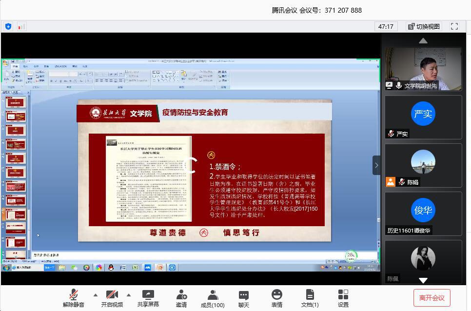2020年6月12日下午2:30,best365英国体育在线通过腾讯会议分两批召开了2020届毕业生返校流程介绍暨安全教育大会。best365英国体育在线副书记胡世先老师,辅导员严实老师、陈娟老师、何宁老师以及2020届全体毕业生(本科生、研究生)参加了此次会议。