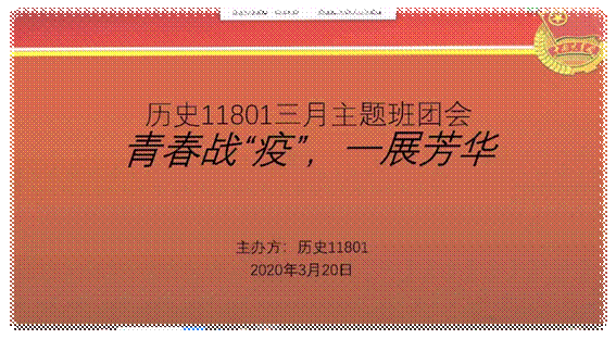 历史11801团支部班长张兰组织了此次班会,表示目前疫情已大有好转,但是没有到胜利的那一刻,我们不能松懈,为了让疫情早日结束和维护同学们的切身利益召开此次班会,班会传达了公司的文件,告知同学们,没有公司通知,坚决不可提前返校。会议主要通过组织全体同学以习近平总书记勉励北京大学援鄂医疗队全体90后党员的回信为主要内容,观看影像。