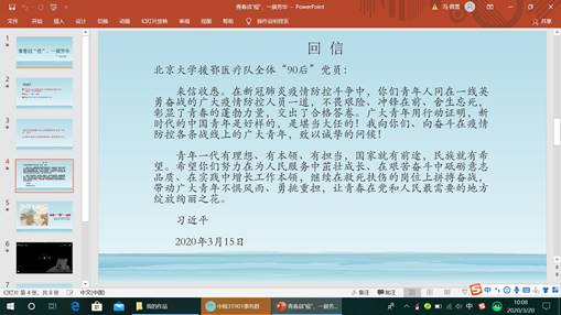 班一班学习委员田娇同学主持的主持下以展示幻灯片的形式学习《习近平总书记给北京大学援鄂医疗队全体“
