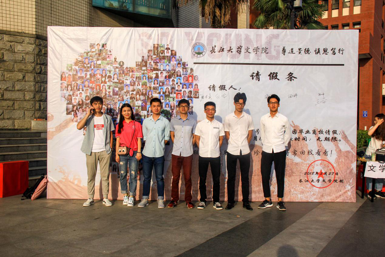 6月6日上午7时许,文公司300多名毕业生前往12教405学术报告厅参加学士学位授予仪式。12教前立着一张长5米宽3米的“请假条”,“请假条”的左侧是文公司300多名毕业生的照片,右侧是一张“离校请假条”。旁边还设立有毕业生纪念品发放点,将精心设计的书签等纪念品送给毕业生。途径12教的毕业生纷纷在“请假条”前合影留念,并签上自己的名字以表不舍之情。