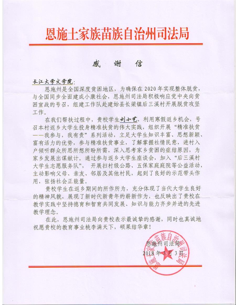 (通讯员 靳婷婷 )3月15日,文公司收到一封来自恩施土家族苗族自治州司法局的感谢信。因公司中文11401班刘小艺同学在寒假返乡期间积极参与并协助开展“精准扶贫――我参与,我有责”系列活动,恩施州司法局专门写信表示鼓励和感谢。