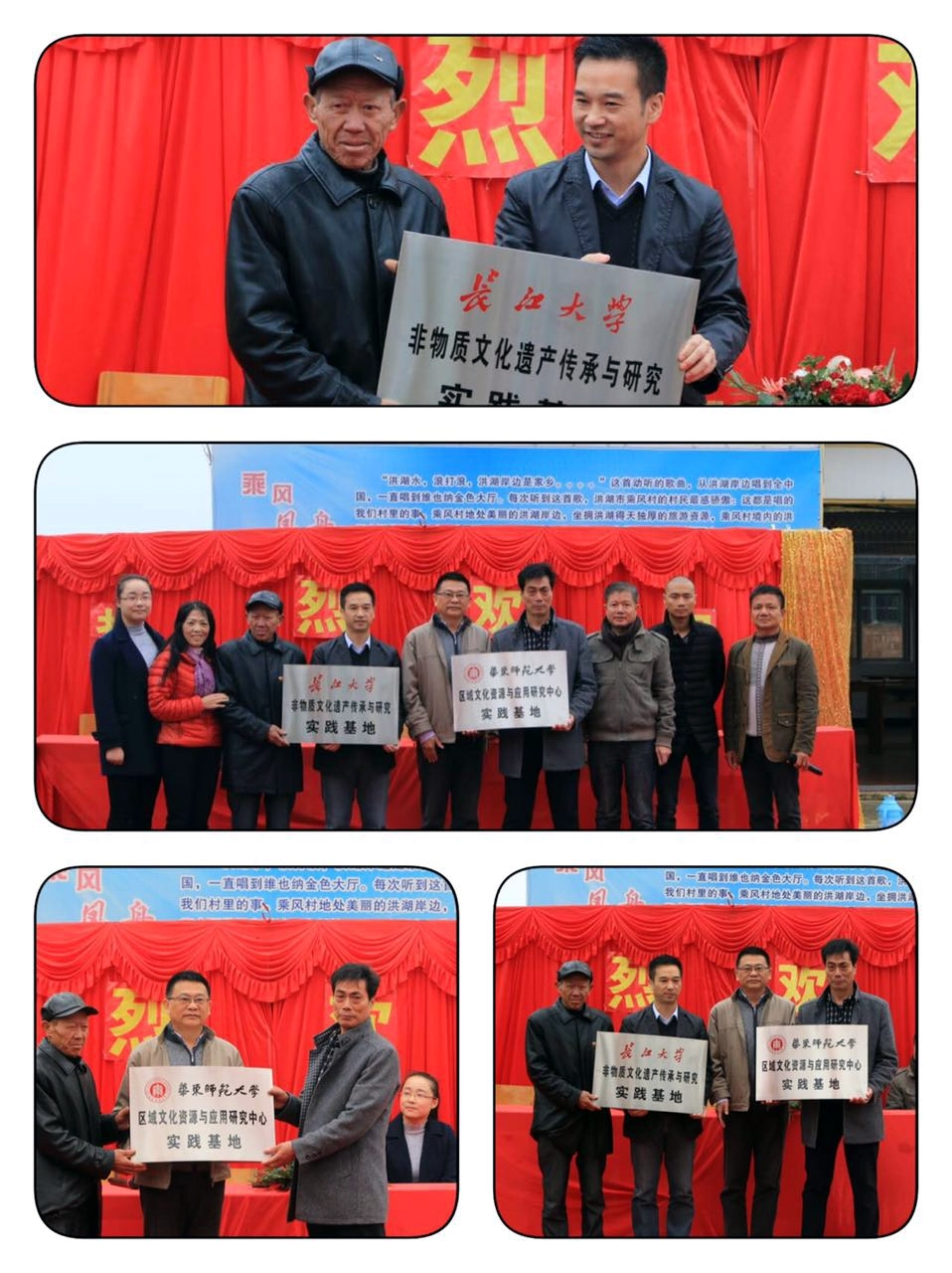 (通讯员 桑 俊)11月1日, best365英国体育在线“非遗传承与研究实践基地”授牌仪式在湖北省洪湖市滨湖镇乘风村成功举行。湖北省非物质文化遗产研究中心(best365英国体育在线)主任桑俊、文公司党委副书记周书航、洪湖市群众艺术馆馆长叶茂、滨湖镇办事处宣传办公室主任徐琴、文化站站长刘久一、乘风村村民委员会主任张国杰、书记连习兵、乘风村凤舟协会会长夏洪树以及部分村民参与了授牌仪式。华东师范大学社会发展公司田兆元教授也参与了授牌仪式,并代表华东师大社会发展公司授予乘风村为该校的“区域文化资源与应用研究中心实践基地”。