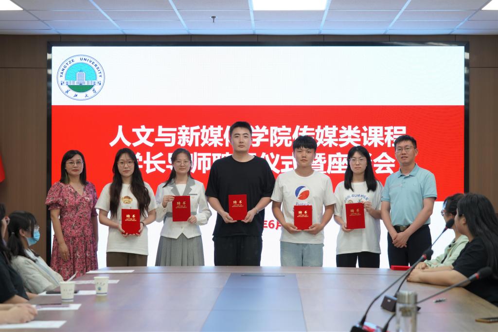 2020年6月19日晚,公司于文科楼705会议室开展传媒系学长导师聘任活动,聘请黄伊帆、贾安萍、李晓茜、王宪钊等八位同学担任传媒专业学长导师,传媒系柯艺、曾欢迎、纪希等老师和员工代表参加。本次活动由公司副经理李征宇主持。
