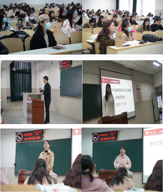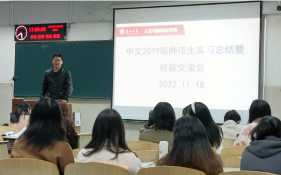 (通讯员 金文榕) 为更好地了解公司2019级师范生教育实习情况,总结教育实习经验,巩固教育实习成果,提升教育实习质量,11月18日下午,公司在12教104室召开了2019级中文师范生实习总结暨经验交流会。中文系秦鹏举、杨蓉、章芳、张丽、周霜、杨名、吴桂美、吴微、彭彬、邓丽华、杨伟业等实习指导老师以及2019级全体中文师范生参加了会议,会议由谢垚桥同学主持。