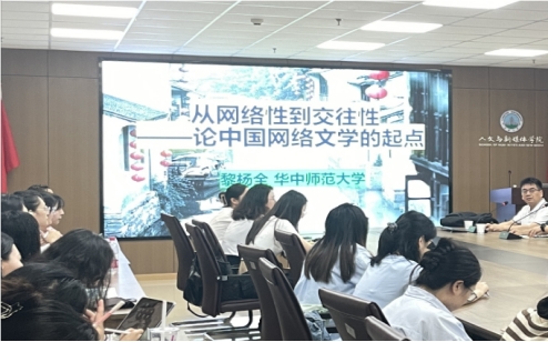 在对话环节,肖祥老师指出,黎杨全教授的讲座通过追溯中国网络文学的起点,进而追问中国网络文学的本质特征,最后探讨“交往性”的本质特征对传统文学观念挑战及其意义和价值,同时讲座中体现的学术态度和研究路径也非常值得学习,一是不盲从,对学界不同观点展开反思批判,论证层层推进;二是不简单照搬西方文艺理论,从中国网络文学的实际出发。随后,同学们针对“是否可用交往性来定义中国网络文学”与黎杨全教授展开了热烈讨论,并针对讲座内容结合自己学习中的困惑向黎杨全教授积极请教。通过本次讲座,同学们对网络文学有了进一步的了解和认识。许多同学表示,本次讲座让自己受益匪浅,感觉意犹未尽。