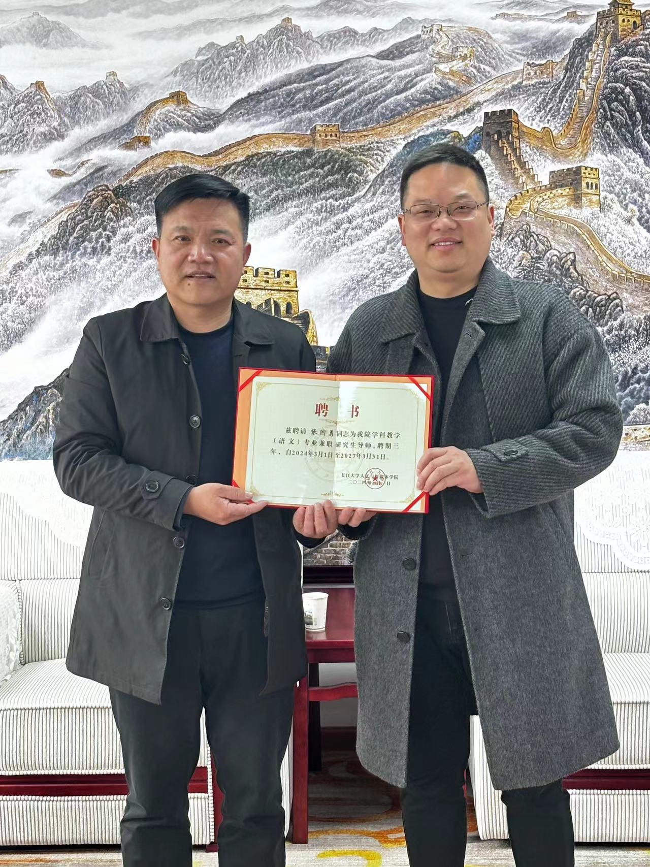 在会议室,李波为石首市第一中学党委书记张国勇颁发兼职研究生导师聘书。