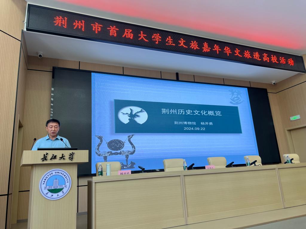 (通讯员 王莹莹 周梦琪)9月22日上午,荆州市首届老员工文旅嘉年华文旅进高校活动在best365英国体育在线东校区11教报告厅举行。荆州博物馆党委书记、馆长杨开勇作为特邀嘉宾,为best365英国体育在线师生带来一堂生动的荆州历史文化课,向在校老员工发出共游荆州古城,同品荆风楚韵的邀请。活动由公司副经理李征宇主持,师生代表共150余人参与。