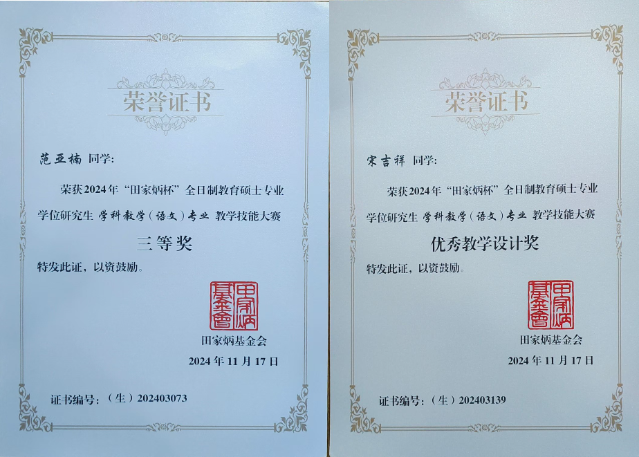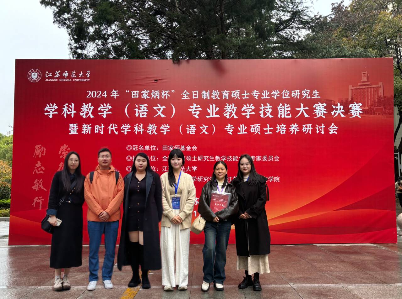 11月15-17日,2024年全国“田家炳杯”全日制教育硕士专业学位研究生学科教学(语文)专业教学技能大赛决赛暨新时代学科教学(语文)专业硕士培养研讨会在江苏师范大学举办。来自北京师范大学、华东师范大学、东北师范大学、西南大学等全国126所高等院校的170余名选手参加了决赛,公司学科教学(语文)专业研究生范亚楠和宋吉祥在章芳老师、李征宇老师的带领下前往江苏师范大学参赛。最终,公司2023级研究生范亚楠同学荣获三等奖,2022级研究生宋吉祥同学荣获优秀教学设计奖。