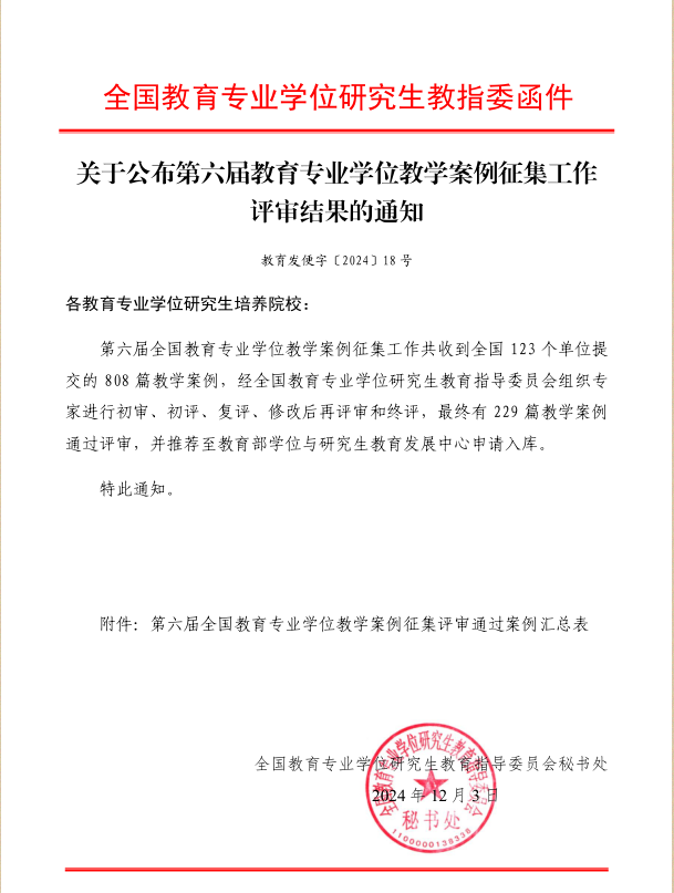 第六届教育专业学位教学案例征集工作由全国教育专业学位研究生教育指导委员会组织开展,共收到全国123个单位提交的808篇教学案例,最终有229篇教学案例通过评审,李征宇教授的案例为公司获评唯一一项。