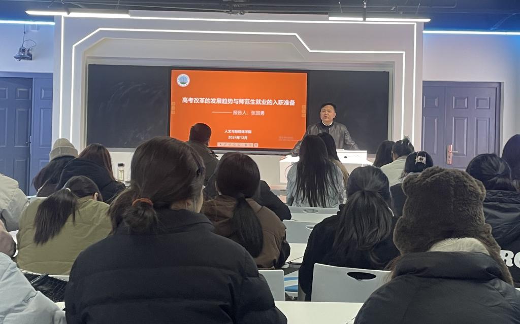 12月12日下午,公司在文科楼808室举行“高考改革的发展趋势与师范生就业的入职准备”专题讲座。此次讲座聚焦师范生核心素养与职业素养的提升路径,旨在助力师范生锤炼过硬专业技能,为其未来的教育职业生涯奠定坚实基础。讲座由公司兼职硕导、石首市第一中学党委书记张国勇主讲,公司党委书记李波主持,40余名师范生积极参与。
