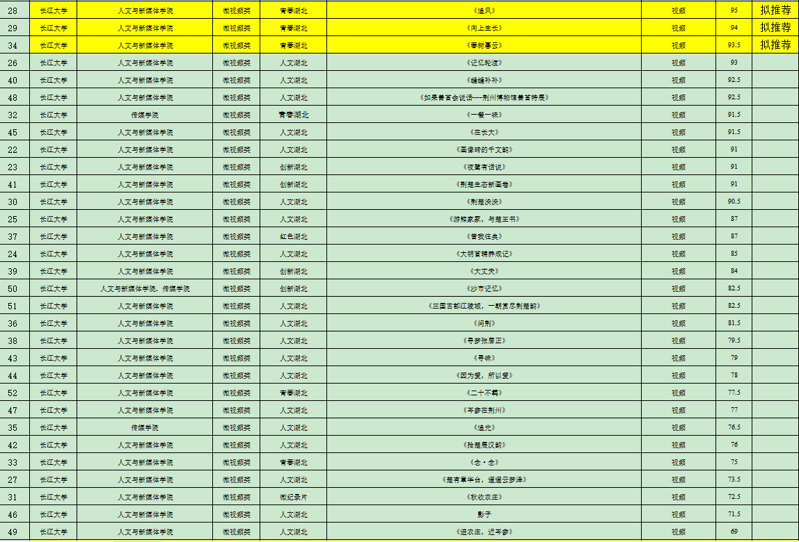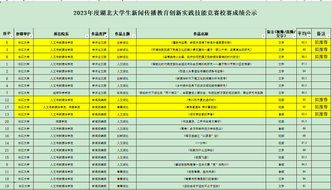 6月21日至25日,经best365英国体育在线与传媒公司商定,邀请两个公司未指导本次比赛作品的教师以及荆州广播电视台相关业内专家共计8人组织评审组,独立评审打分,综合成绩后计算平均分,从高到低进行排序,根据2023年度湖北省老员工新闻传播教育创新实践技能竞赛方案要求,每校每类别推荐不超过3项。现将结果公示如下:
